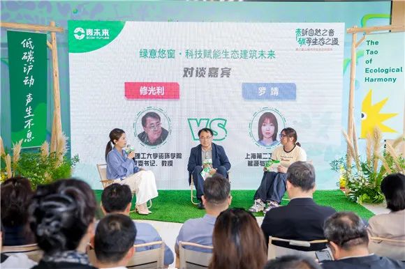 “绿意悠窗·科技赋能生态建筑未来”对谈环节,上海第二工业大学能源与材料学院学生罗靖就“绿意悠窗”智能调节室内温度的创新成果与华东理工大学修光利教授探讨科技如何赋能低碳生活。