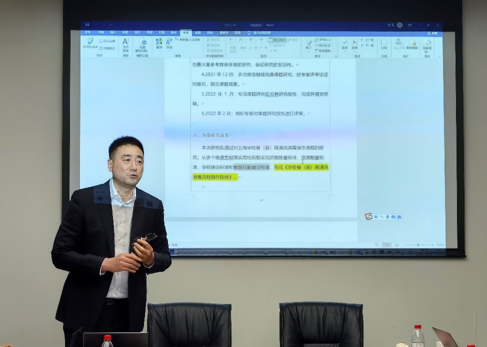 2021年12月22日下午, 餐饮管理专业委员会(以下简称“市协会餐专会”)《优化和规范学校餐(厨)具清洗消毒操作流程》课题开题研讨会在同济大学召开。市协会餐专会主任沈建平、中万恩科技有限公司董事长杨军、中万恩科技有限公司华东大区总经理赵秉燏以及复旦大学、上海交通大学、同济大学、华东理工大学、上海外国语大学、东华大学、上海大学、上海师范大学等高校餐饮分管领导等课题组成员出席会议。会议由市协会餐专会副主任兼秘书长富琴军主持。