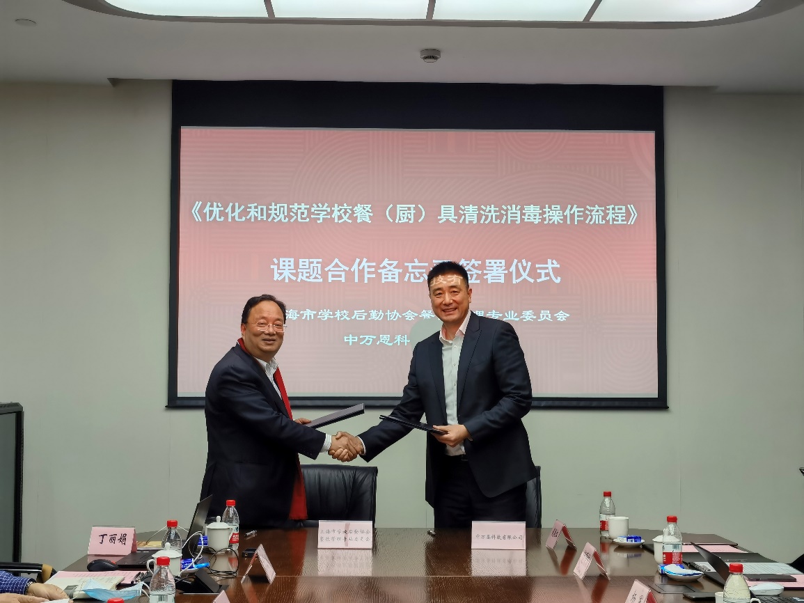 会上, 餐饮管理专业委员和中万恩科技有限公司签署了关于《优化和规范学校餐(厨)具清洗消毒操作流程》课题合作备忘录。同意就本课题的研究、推进和协调开展进一步的交流合作。