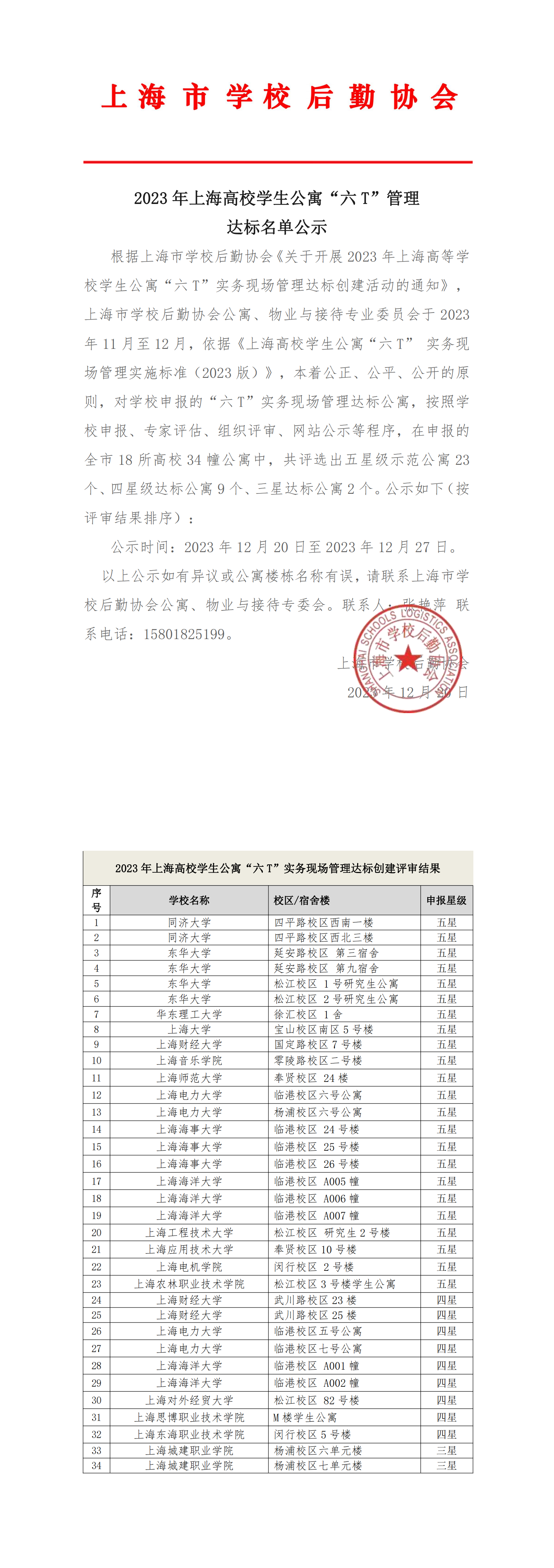 2023 年上海高校学生公寓“六 T”管理 达标名单公示