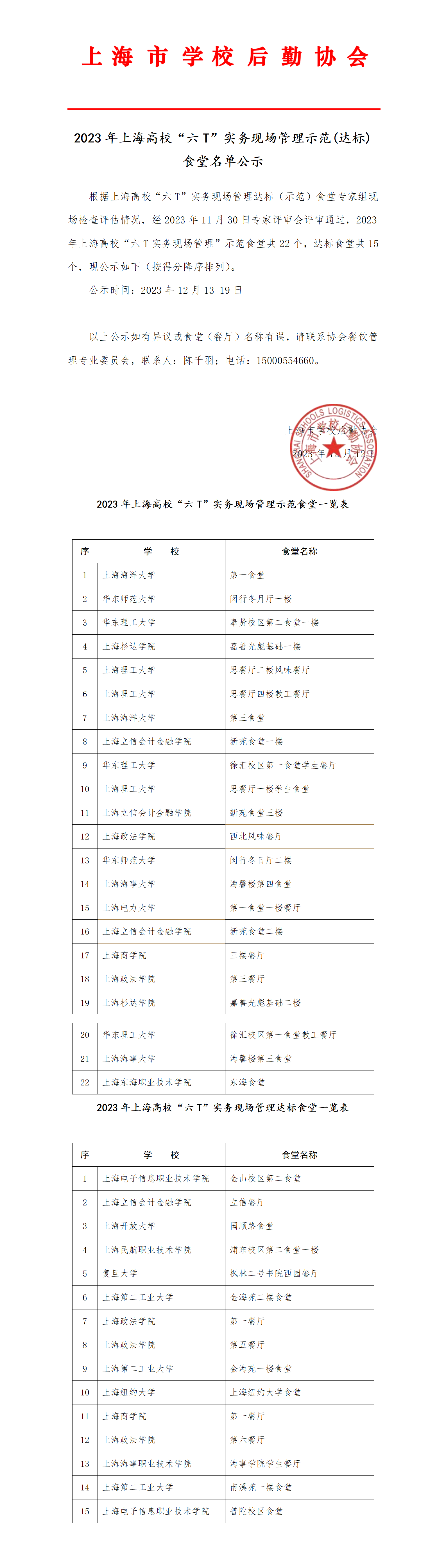 2023年上海高校“六T”实务现场管理示范(达标) 食堂名单公示