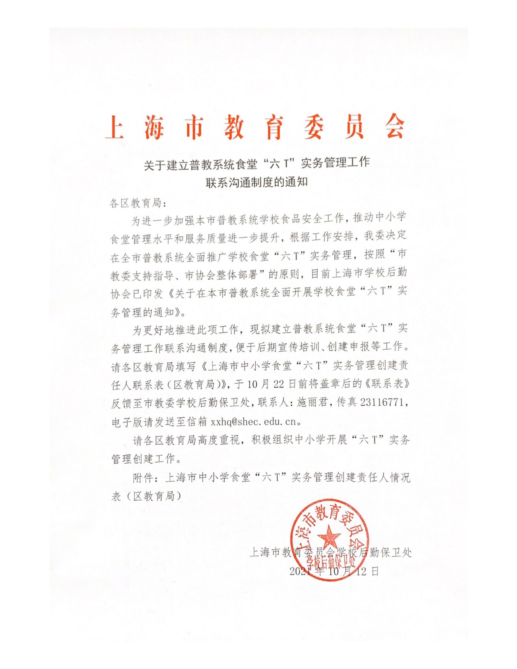 关于在本市普教系统全面开展学校食堂“六 T”实务管理的通知