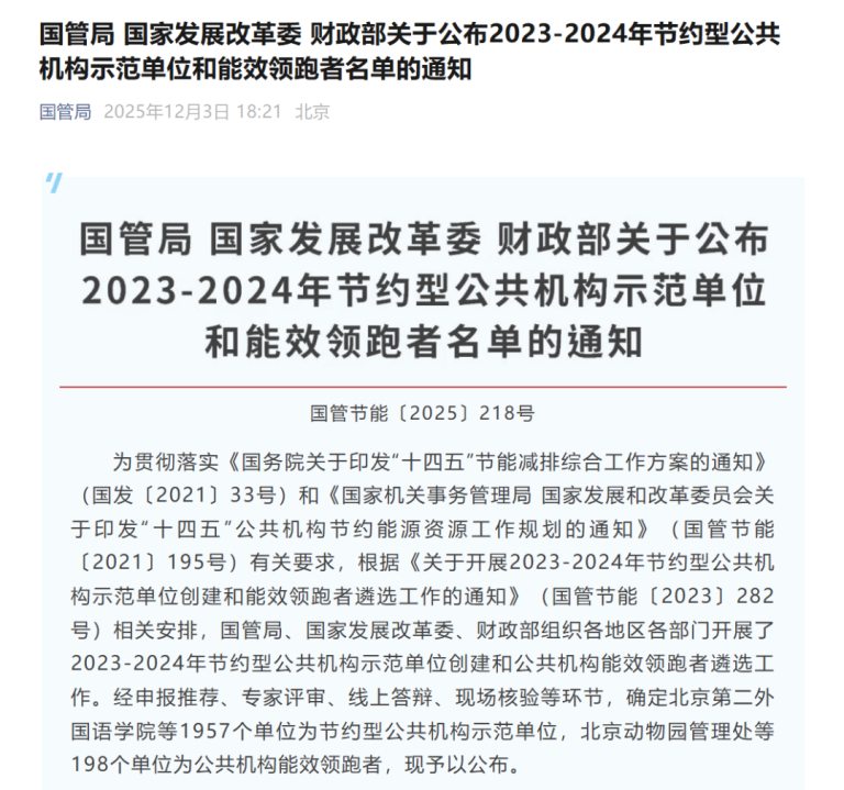 近日,国家机关事务管理局、国家发展和改革委员会、财政部联合开展的2023-2024年节约型公共机构示范单位创建和能效领跑者遴选结果正式公布。上海财经大学凭借在注重建筑用能用水智能化管理,以能源监管平台对重点建筑的水电进行监控为基础,建筑能源资源管理上通过非常规水资源利用、院所指标定额、合同能源管理、合同节水管理推进用能、用水管理运行优化方面的突出成效脱颖而出,成功荣获“公共机构能效领跑者”称号。本次全国共198家单位获评“公共机构能效领跑者”,我校作为中央国家机关上海高校代表入选。